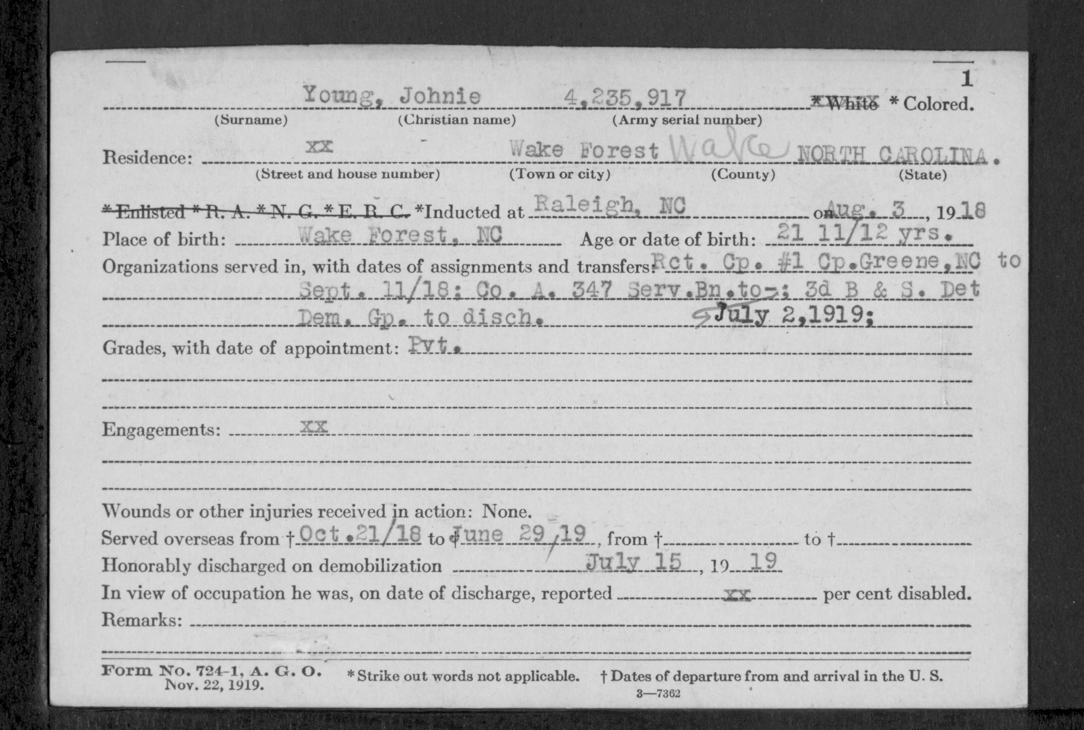 Company: To date: 1918-09-11 Unit: 347 Labor Bn Company: Co A To date: 1919-07-02 Unit: 3rd B & S Det Dem Gp Company: To date: 1919-07-15 |
