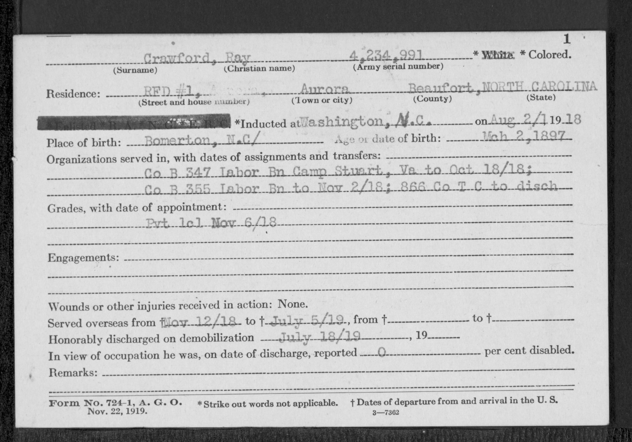Company: Co B To date: 1918-10-18 Unit: 355 Labor Bn Company: Co B To date: 1918-11-02 Unit: 866 Co TC Company: To date: 1919-07-18 |